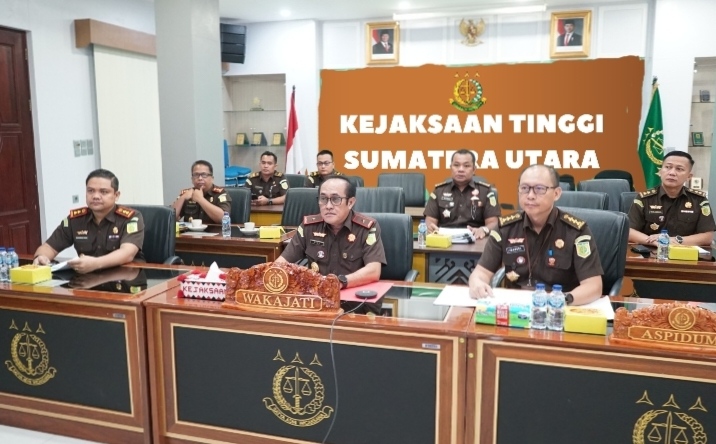 Kepala Kejaksaan Tinggi Sumatera Utara Idianto SH MH diwakili Wakajati Sumut Rudy Irmawan SH MH didampingi Aspidum Imanuel Rudy Pailang SH MH, Kajari Padang Lawas Sinrang SH MH, Kajari Madina M Iqbal SH MH, para Kasi pada Aspidum menyampaikan ekspose 5 perkara ke JAM Pidum Kejaksaan Agung dan diterima langsung oleh Direktur A pada JAM Pidum Nanang Ibrahim Soleh SH MH dan para Kasubdit, dari ruang vicon lantai 2 Kantor Kejati Sumut Jalan AH Nasution Medan, Rabu (16/4/2025).