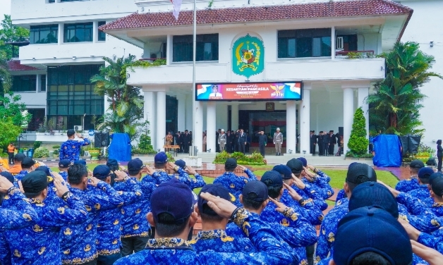 Meski di bawah rintik hujan gerimis namun pelaksanaan Upacara Peringatan Hari Kesaktian Pancasila Tahun 2024 berlangsung dengan penuh khidmat dan lancar di halaman depan Balai Kota Medan, Selasa (1/10/2024).