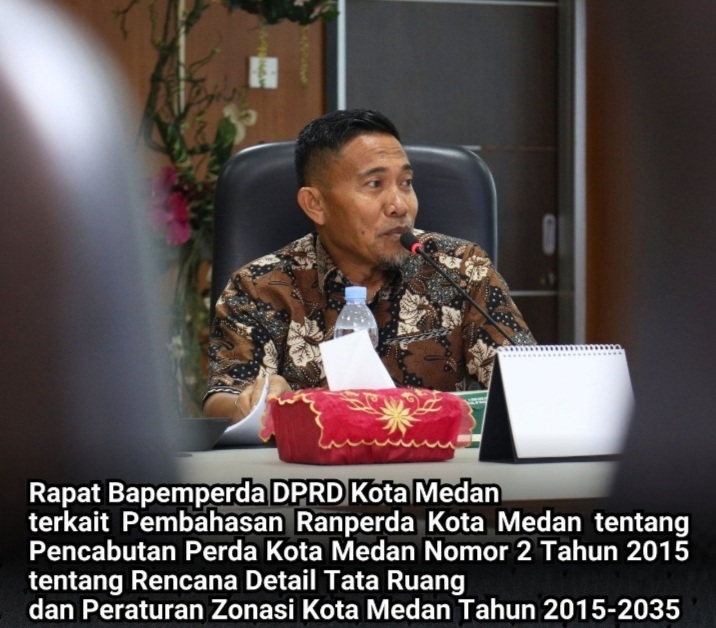 Badan Pembentukan Peraturan Daerah (Bapemperda) DPRD Kota Medan menggelar Rapat Kerja terkait Pembahasan Ranperda Kota Medan tentang Pencabutan Perda Kota Medan Nomor 2 Tahun 2015 tentang Rencana Detail Tata Ruang dan Peraturan Zonasi Kota Medan Tahun 2015-2035, Senin (28/04/2025).