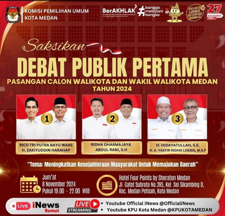 Komisi Pemilihan Umum (KPU) Kota Medan akan menggelar debat kandidat pasangan calon wali kota dan wakil wali kota Medan pada besok hari, Jumat (8/11/2024) di Four Point by Sheraton Jalan Gatot Subbroto Medan yang akan dimulai pada pukul 19.00 WIB-21.00 WIB.