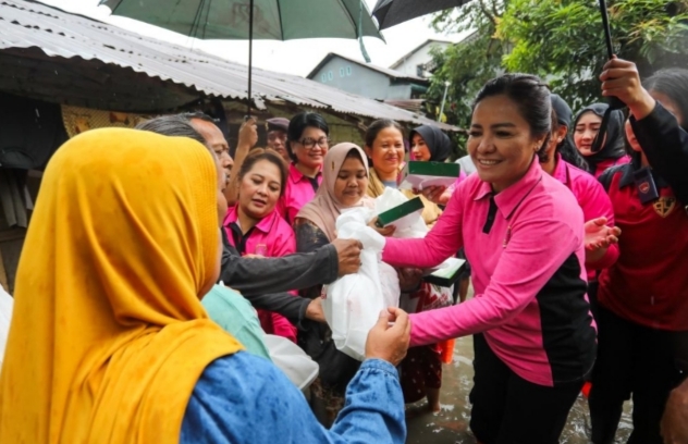 Sementara itu, di posko darurat di Kelurahan Persiakan, Ketua Bhayangkari Polda Sumut Ny Whisnu Hermawan Febrianto dan tim Bhayangkari membagikan sembako kepada warga yang terdampak banjir.