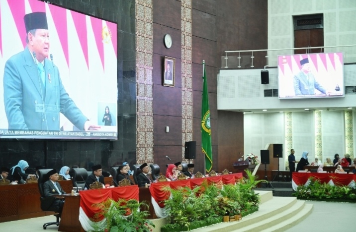 Gubernur Sumatera Utara (Gubsu) Bobby Nasution bersama Wakil Gubernur (Wagub) Surya, mendengarkan pidato kenegaraan Presiden RI Prabowo Subianto, dalam rangka Hari Ulang Tahun (HUT) ke-80 Kemerdekaan Republik Indonesia. Acara yang berlangsung secara virtual itu dilaksanakan di Gedung Paripurna DPRD Sumut, Jalan Imam Bonjol Medan, Jumat (15/8/2025).