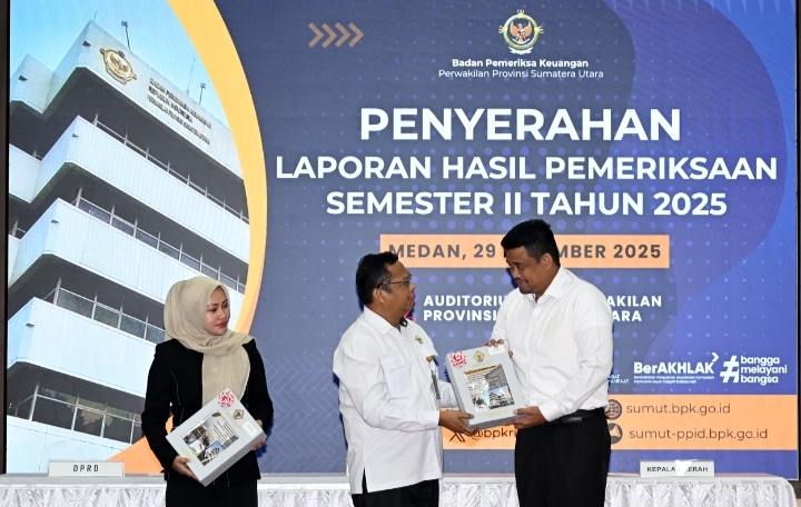 Hal ini disampaikan Bobby Nasution saat menghadiri acara Penyerahan Laporan Hasil Pemeriksaan (LHP) Kepatuhan atas Kegiatan Peningkatan Sarana dan Prasarana Pendidikan di Pemprov Sumut dan instansi terkait lainnya, Tahun 2024 sampai Semester II Tahun 2025 yang digelar di Auditorium BPK Perwakilan Provinsi Sumut, Jalan Imam Bonjol, Medan, Senin (29/12/2025).