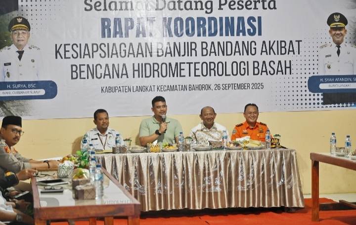 Gubernur juga menggelar rapat koordinasi kesiapsiagaan banjir bandang akibat bencana hidrometeorologi basah secara virtual bersama Kepala BMKG RI Dwikorita Karnawati di Kantor Camat Desa Timbang Jaya Kecamatan Bahorok, Kabupaten Langkat, Jumat (26/9/2025) lalu. (HS)
