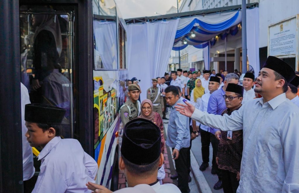 Dengan mengucapkan bismillahirrahmanirrahim, Wali Kota Medan Bobby Nasution meluncurkan beroperasinya bus wisata dari halaman depan Gedung CC Room ITS Kota Medan Jalan Balai Kota Medan, Kamis (4/4/2024) petang.