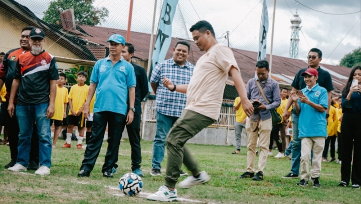 Dengan melakukan tendangan kick off, Wali Kota Medan Bobby Nasution menandai opening ceremony Kompetisi Liga Mini Soccer Tingkat SMP, di IsoBu Stadium Jalan Titi Papan Kelurahan Sei Sikambing D, Kecamatan Medan Petisah, Minggu (22/1/2023).