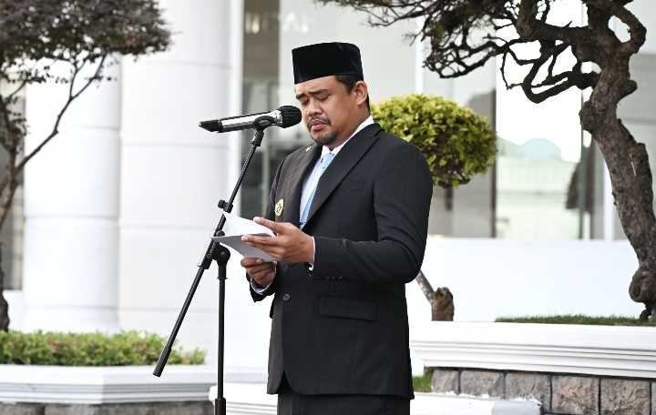 Gubernur Sumatera Utara (Gubsu) Bobby Nasution memimpin Upacara Bendera dalam rangka Peringatan Hari Lahir (Harla) Pancasila Provinsi Sumut tahun 2025. Kegiatan tersebut berlangsung di Lapangan Apel, Kantor Gubernur Sumut, Jalan Diponegoro Nomor 30 Medan, Senin (2/6/2025).