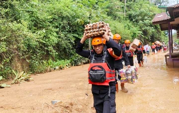 Namun, mundur bukan pilihan. Personel Brimob kemudian memutuskan membawa bantuan secara manual, memanggul dus sembako, menggendong paket makanan, dan berjalan kaki menyusuri medan licin yang penuh lumpur menuju Desa Robean dan Desa Sibulan Bulan, dua wilayah yang hingga saat ini belum bisa diakses kendaraan roda dua maupun roda empat.