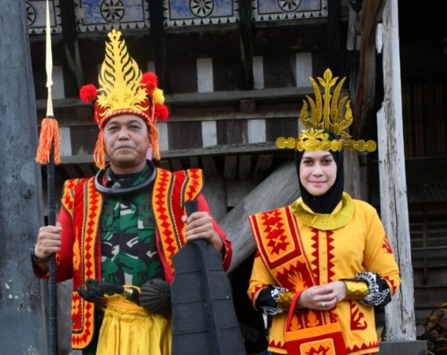 Setibanya di Desa Bawomataluo Danrem beserta Ibu Triwinarto disambut sebagai tamu kehormatan dengan penyematan Baju Adat Lengkap oleh Bupati dan Wakil Bupati Nias Selatan didampingi tokoh adat.