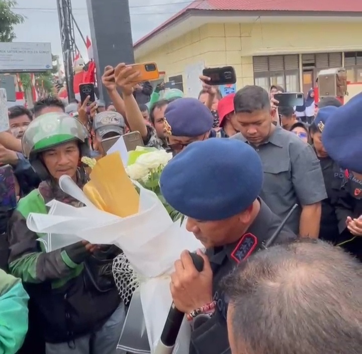 Ratusan driver ojek online (ojol) bersama personel dan Polwan Brimob berkumpul, dipimpin langsung oleh Komandan Satuan Brimob Polda Sumut, Kombes Pol Rantau Isnur Eka SIK MM MH MHan untuk menggelar doa bersama.