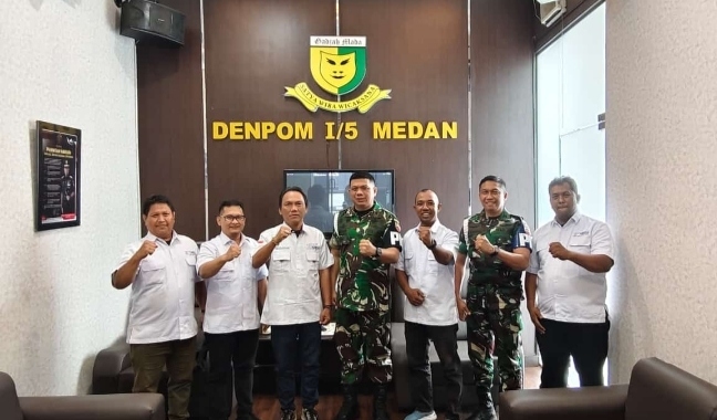 Detasemen Polisi Militer (Denpom) l/5 Medan.Letkol CPM Hanri Wira Kusuma SH MHan didampingi Letda Pebri Tobing, Dan Unik Lidik Denpom 1/5 Medan menerima kunjungan kerja (Kunker) dan silaturahmi pengurus Serikat Media Siber Indonesia Kota Medan diruang pertemuan Denpom 1/5 Medan, Jalan Letjen Suprapto No 4 Kelurahan Hamdan, Kecamatan Medan Maimun, Kota Medan, Provinsi Sumatera Utara, Senin (3/2/2025).