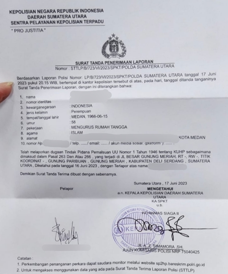 Laporan Polisi Nomor: LP/B/723/VI/2023/SPKT/Polda Sumatera Utara tanggal 17 Juni 2023 pukul 20.15 WIB.