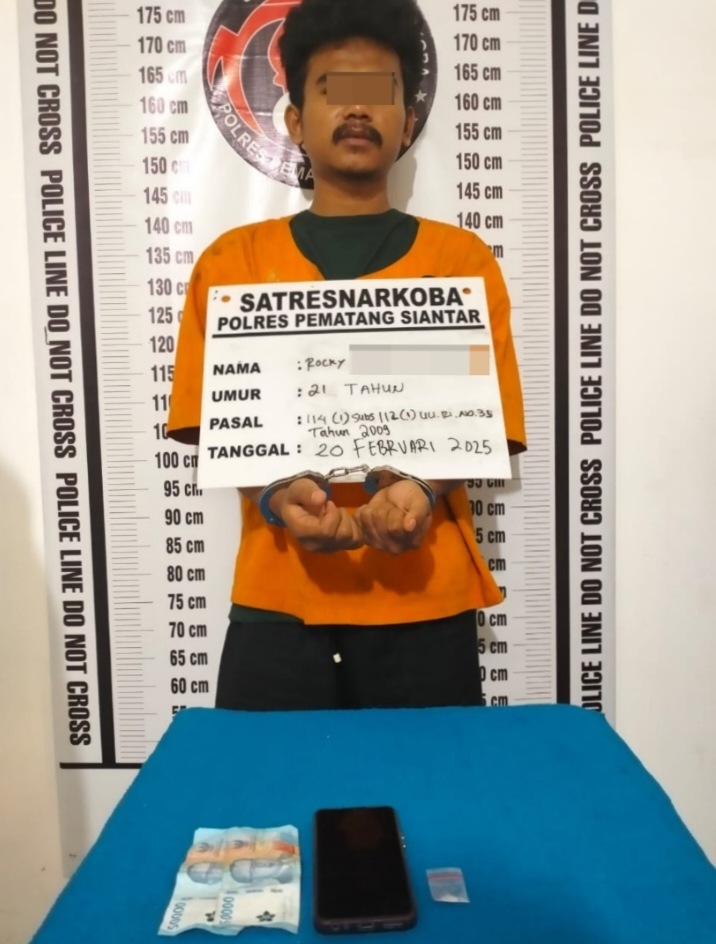Satuan Reserse Narkoba Polres Pematangsiantar Gagalkan Edarkan Sabu dengan menangkap RDT (21) warga Jalan Desa Indah Perumahan Tojai Lama, Kelurahan Setia Negara, Kecamatan Siantar Sitalasari, Kota Pematangsiantar, Provinsi Sumatera, Jumat (21/2/2025).
