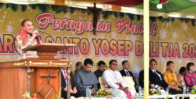 “Tantangan kita ke depan akan semakin berat, perekonomian, era disrupsi, perkembangan teknologi, itu harus kita hadapi dan jangan pernah kehilangan keimanan kita sebagai pegangan utama dalam hidup”, kata Edy Rahmayadi, saat perayaan Natal Paroki Santo Yosep Delitua di Wisma Deli Persada Delitua, Jalan Kesehatan, Deliserdang.