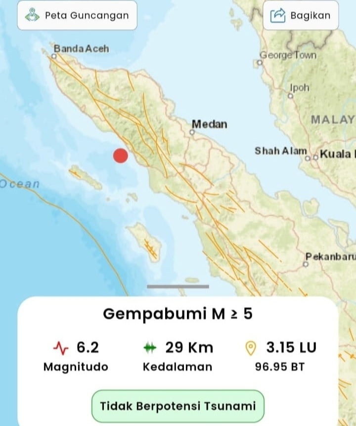 Gempa bumi berkekuatan 6,2 magnitudo mengguncang wilayah Aceh pada Jumat (31/1/2025) pukul 18.03 WIB. Guncangan kuat yang dirasakan di sejumlah daerah membuat warga panik dan berhamburan keluar rumah. Meski demikian, Badan Meteorologi, Klimatologi, dan Geofisika (BMKG) memastikan bahwa gempa ini tidak berpotensi menimbulkan tsunami.