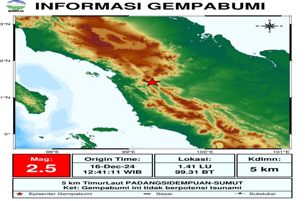 Balai Besar Meteorologi Klimatologi dan Geofisika (BMKG) Wilayah I Medan diduga mengeluarkan peringatan telah terjadi Gempa tektonik berkekuatan Mag 2.5 diwilayah Padangsidempuan, Sumatera Utara, Senin (16/12/2024) siang.