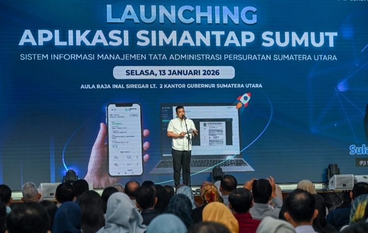 “Sistem ini tujuan utamanya mempercepat dan mempermudah, jangan lari dari konsep ini, mudah-mudahan ini bisa dipenuhi,” kata Bobby saat meluncurkan SIMANTAP SUMUT di Aula Raja Inal Siregar, Kantor Gubernur, Jalan Pangeran Diponegoro Nomor 30, Medan, Selasa (13/1/2026).