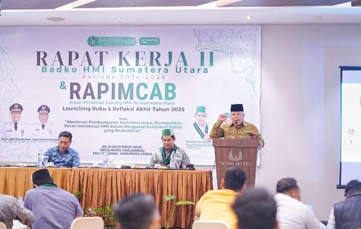 Kepala Kejaksaan Tinggi Sumatera Utara Dr Harli Siregar SH MHum membuka secara resmi rapat kerja (Raker) II dan rapat pimpinan cabang Badan Koordinasi (Badko) Himpunan Mahasiswa Islam Sumatera Utara yang berlangsung di Wings Hotel Kualanamu, Kabupaten Deliserdang, Sabtu (20/12/2025).