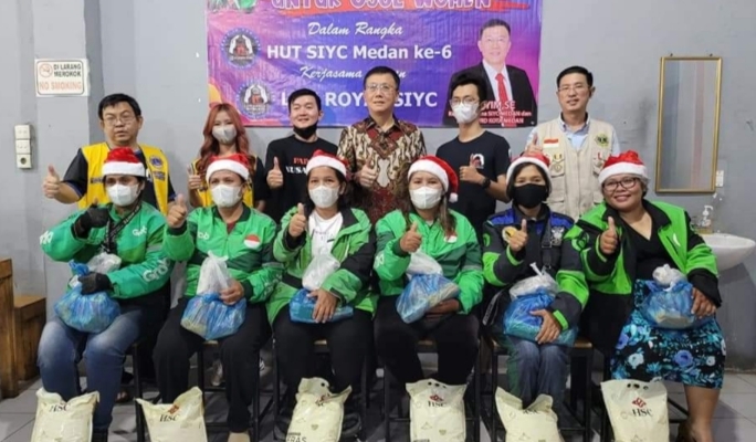 Ketua DPRD Kota Medan Hasyim SE bersama Komunitas Share If You Care (SIYC) Medan bersama Lions Club Medan (LCM) dan Royal SIYC membagikan sembako kepada perempuan yang berprofesi sebagai pengendara (driver) ojek online, Senin (5/12/2022).