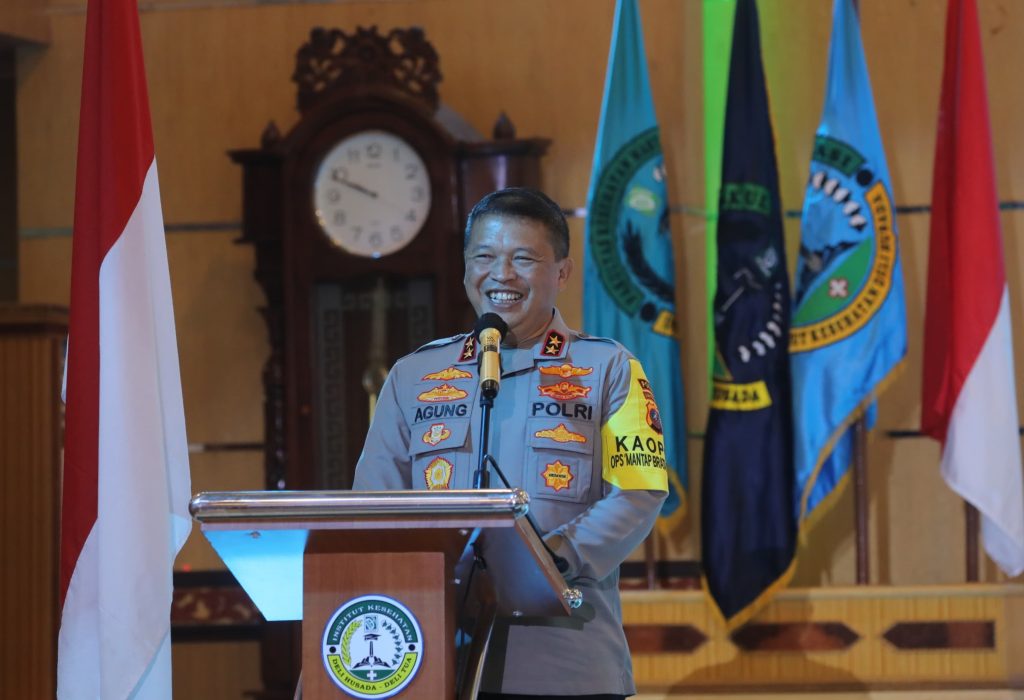 Kapolda Sumut Irjen Pol Agung Setya Imam Effendi memberikan kuliah umum kebangsaan, kepada ribuan mahasiswa Institut Kesehatan Deli Husada, di Delitua, Selasa (23/1/2024).