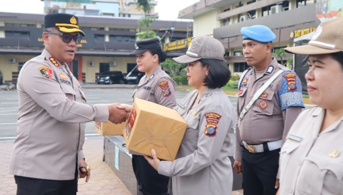 Usai apel, Kapolrestabes Medan menyerahkan bingkisan Natal dan Tahun Baru secara simbolis kepada perwakilan personel Pama, Brigadir, Aparatur Sipil Negara (ASN), dan PHL Polrestabes Medan. (HS)