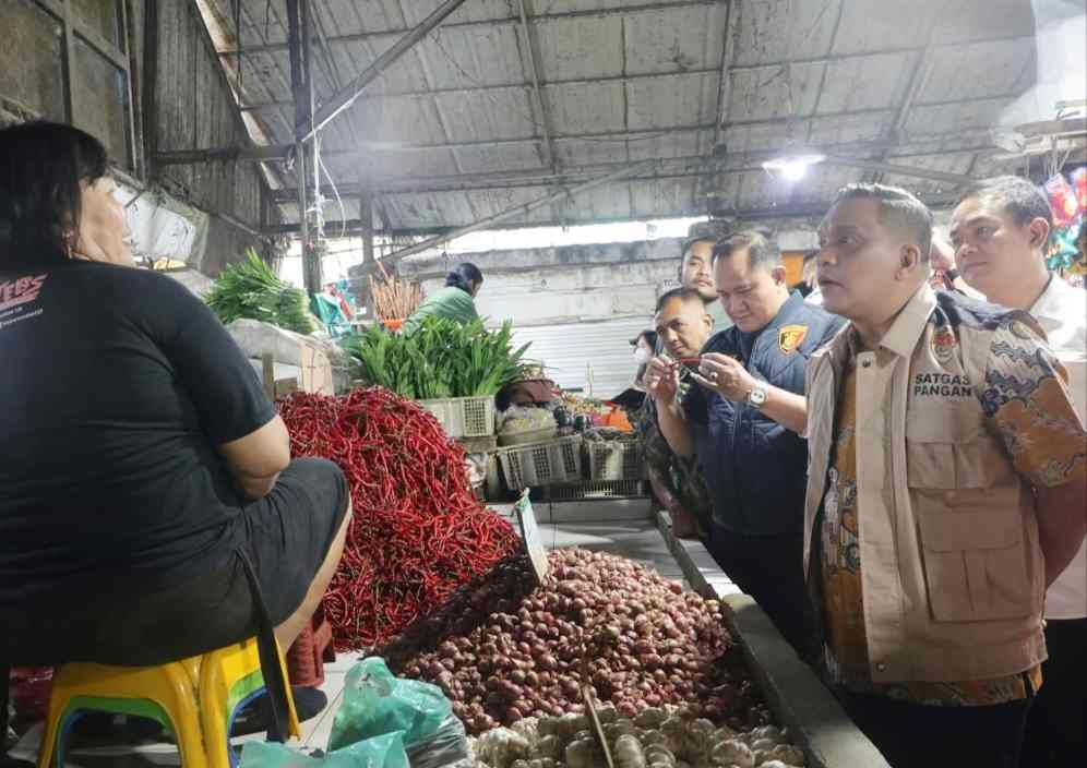 Tim Satgas Pangan Polri bersama jajaran Pemerintah Provinsi Sumatera Utara dan Perum Bulog melakukan pengecekan langsung harga dan ketersediaan bahan pokok penting (bapokting) di Pasar Simpang Limun, Kota Medan, Jumat (13/2/2026).