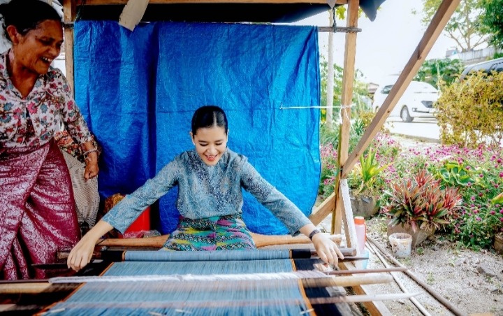 Ketua Dewan Kerajinan Nasional Daerah (Dekranasda) Sumatera Utara (Sumut) Kahiyang Ayu mengunjungi Galery Ulos Hutaraja yang berada di kawasan Kampung Ulos Hutaraja, Dusun II, Desa Lumban Suhi-suhi Toruan, Kecamatan Pangururan, Kabupaten Samosir, Minggu (4/5/2025). Kahiyang terkesima dengan para penenun yang kreatif dalam membuat ulos secara manual. Apalagi, mendengar penjelasan penenun tentang berbagai jenis ulos di Sumut.