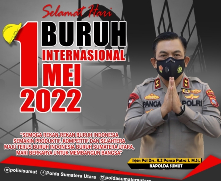 Kapolda Sumut, Irjen Pol RZ Panca Putra Simanjuntak, mengucapkan selamat Hari Buruh 2022. Semoga seluruh elemen buruh di Sumatera Utara, Indonesia dapat semakin sejahtera.