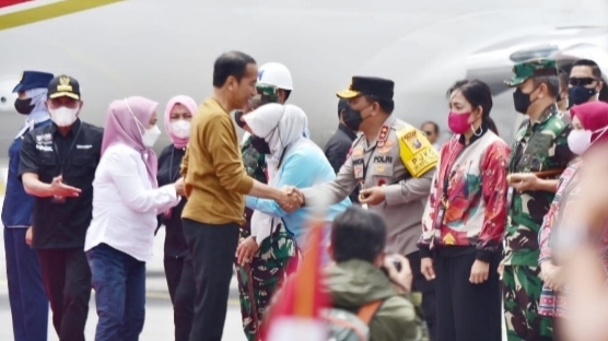 Setibanya di Bandara Silangit, Presiden RI Jokowi didampingi istri Iriana langsung disambut Kapolda Sumut Irjen Pol Drs RZ Panca Putra Simanjuntak MSi, Pangdam I Bukit Barisan Mayjen TNI Daniel A Chardin serta Gubernur Sumut Edy Rahmayadi.