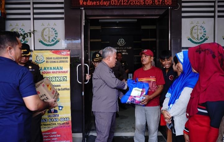 Setelah melihat dan menyapa jajaran Kejaksaan Labuhan Deli, kemudian rombongan memberikan bantuan berupa paket sembako dan makanan ringan kepada keluarga besar jajaran Cabang Kejaksaan Negeri Labuhan Deli yang terdampak bencana hingga kepada masyarakat atau warga yang terdampak bencana banjir di daerah terdekat dengan letak kantor tersebut.