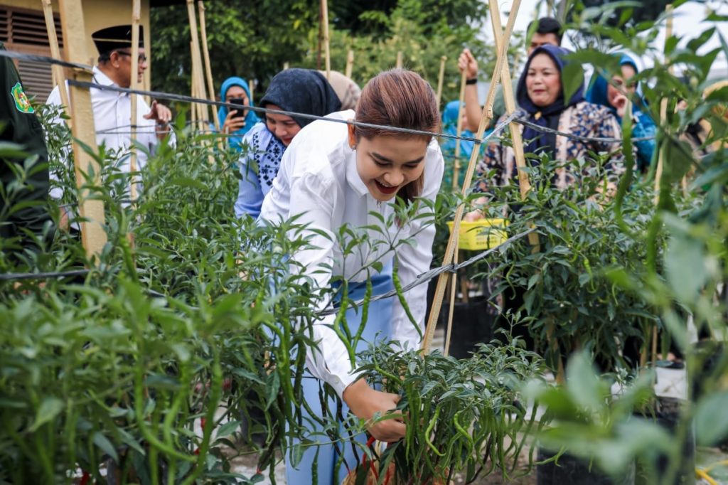 Ketua TP PKK Kota Medan Kahiyang Ayu Bobby Nasution melakukan panen Cabai merah bersama kelompok tani Bogainvile di lahan pekarangan jalan Karikatur, Kelurahan Pulo Brayan Darat II, Kecamatan Medan Timur, Senin (12/2/2024). Hasil panen ini akan dijual kepada masyarakat disekitarnya guna mencukupi kebutuhan rumah tangga.