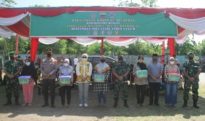 Dandim 0201/Medan Kolonel Inf Ferry Muzawwad SIP hadir dalam kegiatan Bakti Sosial Kodim 0201/Medan bersinergitas dengan Lions Club dalam Rangka Bulan Suci Ramadhan dan Menyambut Idul Fitri Tahun 1443 H, bertempat di lapangan Jalan Abadi 3, Kecamatan Medan Sunggal, Kota Medan, Sabtu (16/4/2022)