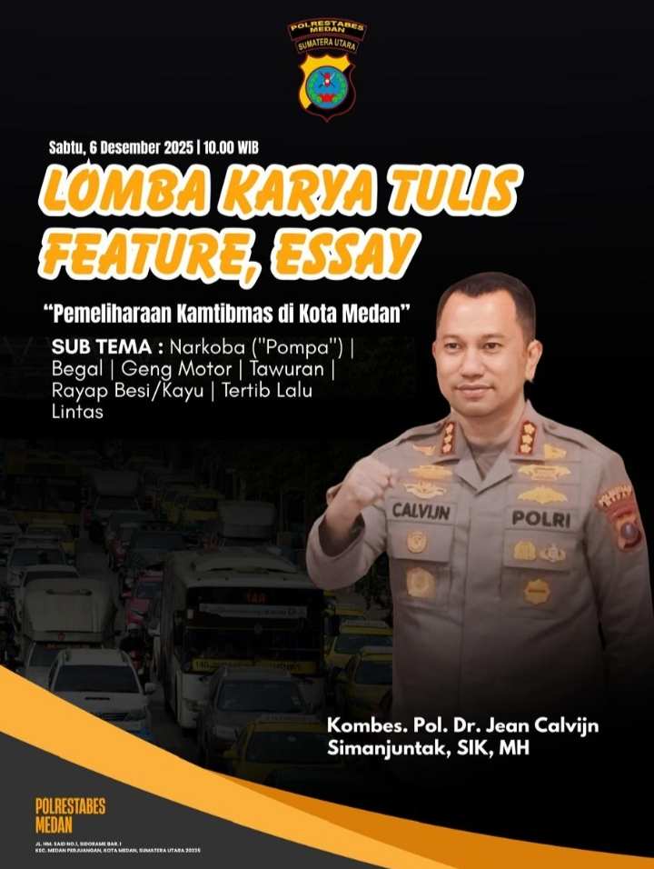 Dalam rangka mengoptimalkan peran media dalam menciptakan opini publik yang sehat terkait keamanan masyarakat, Kapolrestabes Medan Kombes Pol Dr Jean Calvijn Simanjuntak SIK MH menggelar Kapolrestabes Medan Cup – Lomba Karya Tulis Jurnalistik di Aula Patriatama Polrestabes Medan, Sabtu (6/12/2025).