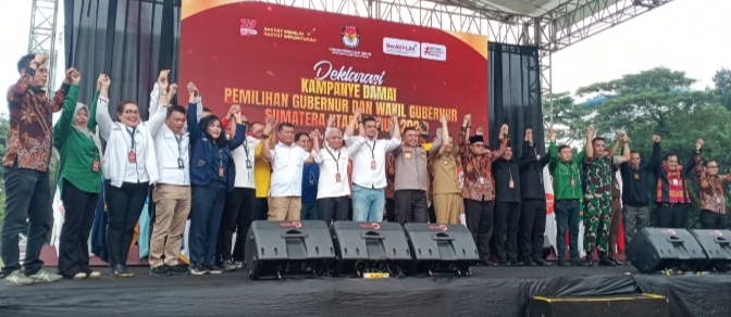 Komisi Pemilihan Umum Provinsi Sumatera Utara (KPU Provsu) melaksanakan deklarasi kampanye damai pemilihan Gubernur dan Wakil Gubernur Sumatera Utara Tahun 2024 di Lapangan Benteng Jalan Pengadilan, Kelurahan Petisah Tengah, Kecamatan Medan Petisah, Kota Medan, Sumatera Utara, Selasa (24/9/2024).