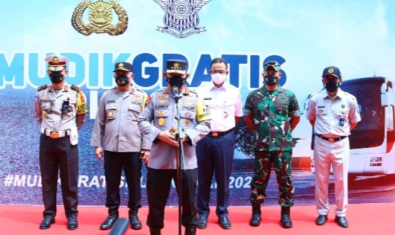 Kapolri Jenderal Listyo Sigit Prabowo melepas mudik gratis Polri 2022 di Parkir Timur Gelora Bung Karno (GBK) Senayan, Jakarta, Jumat (29/4/2022). Sebanyak 220 bus dengan penumpang 11.300 mengikuti progam mudik gratis ini dengan tujuan Jawa Barat, Jawa Tengah, DIY dan Jawa Timur.