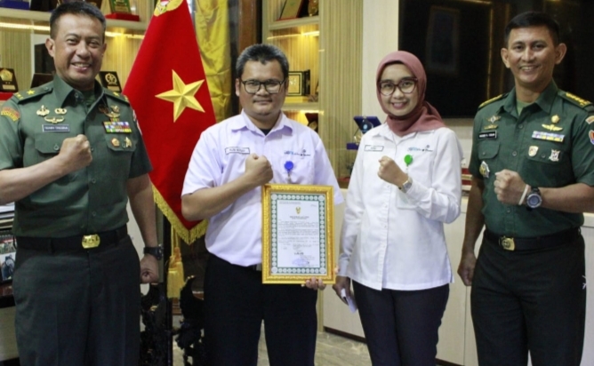 Kepala Dinas Penelitian dan Pengembangan TNI AD (Kadislitbangad) Brigjen TNI Terry Tresna Purnama, SIKom MM menyerahkan sertifikat lulus uji munisi kaliber 7,62 x 51 mm 175 Grains HPBT (Mu2-M A1 dan Mu2-M A2) buatan dalam negeri kepada Hera Rosmiati selaku Manager Rekayasa Mutu PT. Pindad persero, di Madislitbangad, Matraman, Jakarta, Rabu (8/6/2022).