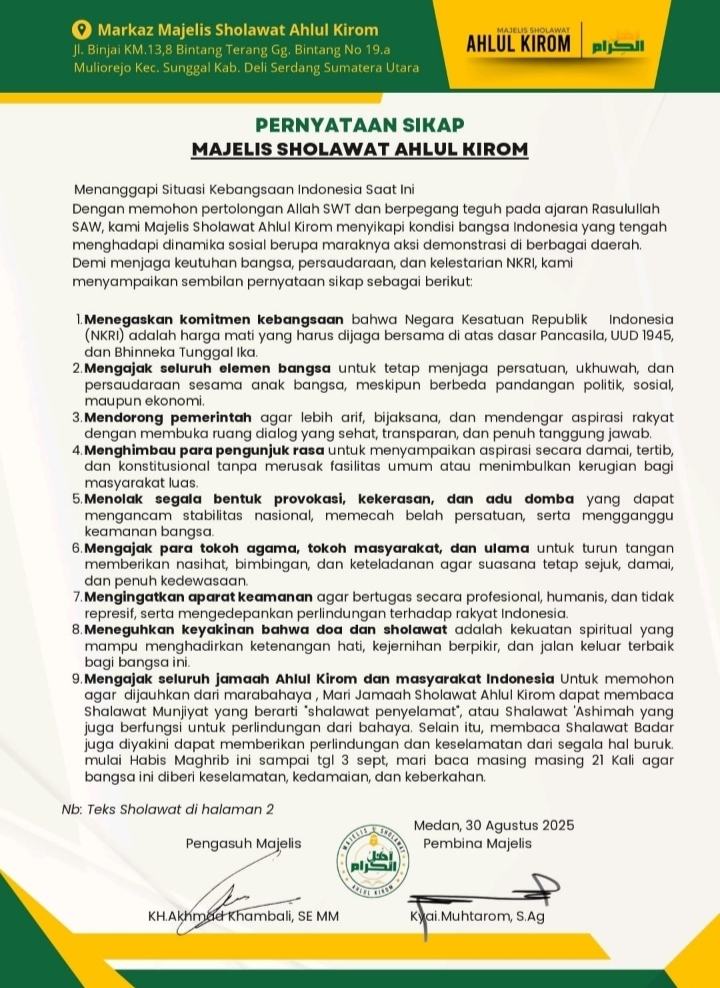 Dalam pernyataannya, Majelis Sholawat Ahlul Kirom menyampaikan sembilan butir sikap sebagai bentuk keprihatinan sekaligus doa bagi Indonesia.