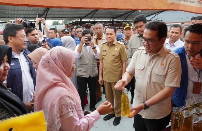 Menteri Perdagangan (Mendag) Budi Santoso bersama Wali Kota Medan Bobby Nasution memantau kegiatan Gerakan Pangan Murah (GPM) di Taman Sakasanwira, Jalan Kapten Rahmad Buddin, Kecamatan Medan Marelan, Selasa (17/12/2024).