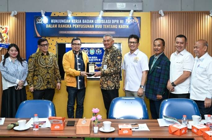 Penjabat (Pj) Sekretaris Daerah Provinsi (Sekdaprov) Sumatera Utara (Sumut), Sulaiman Harahap menerima kunjungan kerja (Kunker) tim Badan Legislasi (Baleg) DPR RI di Kantor Kamar Dagang dan Industri (KADIN) Sumut, Jalan Sekip Baru, Medan, Kamis (18/12/2025) siang.