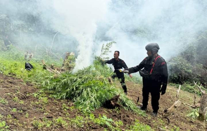 Sekitar pukul 13.00 WIB, tim gabungan akhirnya tiba di lokasi ladang ganja yang tersembunyi di area perbukitan terpencil. Di bawah terik matahari dan medan yang cukup berat, personel Brimob dengan sigap melaksanakan pemusnahan terhadap ribuan batang tanaman ganja dengan cara pembakaran di tempat. Kegiatan pemusnahan ini berlangsung dengan lancar dan diawasi langsung oleh Kompol Zaenal Muhlisin selaku pimpinan lapangan.