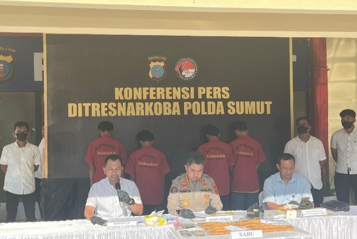 Direktorat Reserse Narkoba Polda Sumatera Utara (Ditresnarkoba Poldasu) bekerja sama dengan petugas Aviation Security (Avsec) Bandara Internasional Kualanamu berhasil menggagalkan penyelundupan narkotika jenis sabu seberat 5 kilogram yang dibawa oleh empat orang tersangka dengan modus body wrapping, Selasa malam, 15 April 2025.