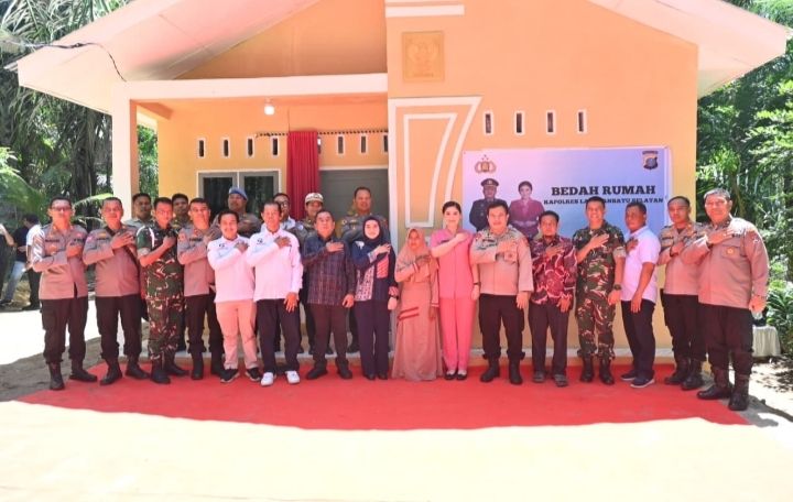Kapolres Labusel AKBP Aditya SP Sembiring Muham, meresmikan hasil program bedah rumah dan secara simbolis menyerahkan kunci rumah kepada Junaedi dan keluarga, warga Dusun Pasar 12, Desa Aek Batu, Kecamatan Torgamba, Kabupaten Labusel, Sabtu (1/11/2025).