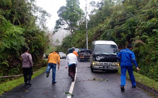 Pohon tumbang di jalan lintas Porsea Kanopan yang sempat menghambat arus Lalulintas melintang di tengah jalan umum Pintu Pohan Meranti Kabupaten Toba, akhirnya di evakuasi Personil Polsek Porsea.