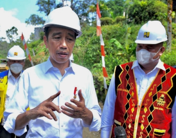 Presiden Joko Widodo meninjau proyek peningkatan struktur jalan Laehuwa-Ombolata-Tumula-Faekhuna’a di Kabupaten Nias Utara, Provinsi Sumatra Utara, pada Rabu, 6 Juli 2022. Pembangunan infrastruktur jalan tersebut dimaksudkan untuk membangun konektivitas antarwilayah di Pulau Nias.
