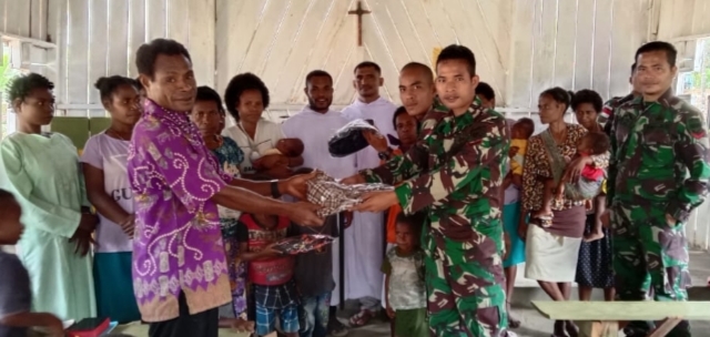 Dalam rangka perayaan hari Raya Paskah di wilayah perbatasan, anggota Pos Tatakra Satgas Pamtas RI-PNG Yonif 126/KC melaksanakan ibadah sekaligus Bhakti Sosial membagikan pakaian baru kepada jemaat Gereja ST Yohanes di Kampung Tatakra, Distrik Web, Kabupaten Keerom.