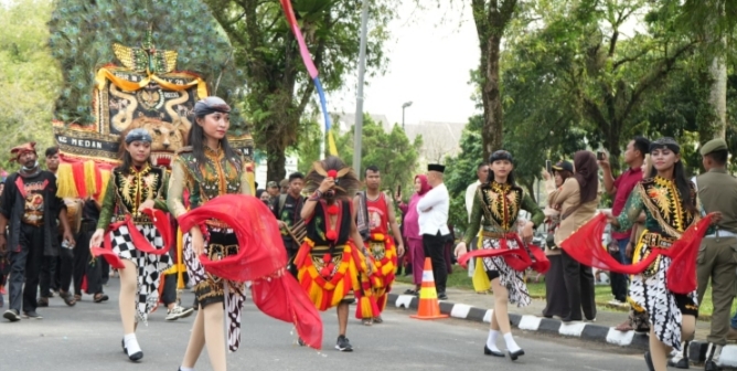 Ribuan masyarakat dari berbagai etnis dan agama yang ada di kota Medan tumpah ruah ikut serta memeriahkan pawai ta’aruf MTQ ke 56 tingkat Kota Medan yang digelar di Stadion Mini USU, Sabtu (25/2/2023).
