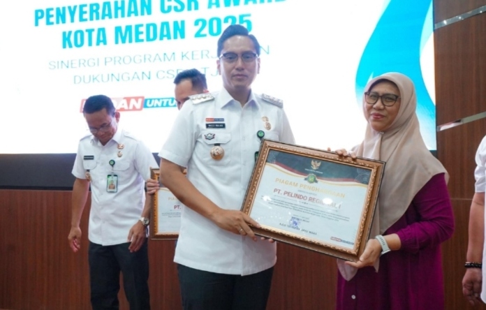 Wali Kota Medan Rico Tri Putra Bayu Waas menyerahkan CSR Award kepada tiga perusahaan dengan penyaluran Corporate Social Responsibility (CSR) terbesar pada 2024. Ketiga perusahaan itu PT Pelabuhan Indonesia (Pelindo) Regional I, Bank Sumut, PTPN IV Regional I.