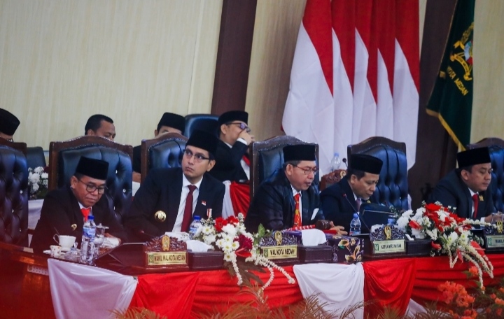 Wali Kota Medan Rico Tri Putra Bayu Waas bersama Wakil Wali Kota Medan H Zakiyuddin Harahap menghadiri Rapat Paripurna DPRD Kota Medan dengan agenda Mendengarkan Pidato Kenegaraan Presiden Republik Indonesia (RI) dalam rangka HUT ke- 80 Kemerdekaan RI di Gedung DPRD Medan, Jumat (15/8/2025).