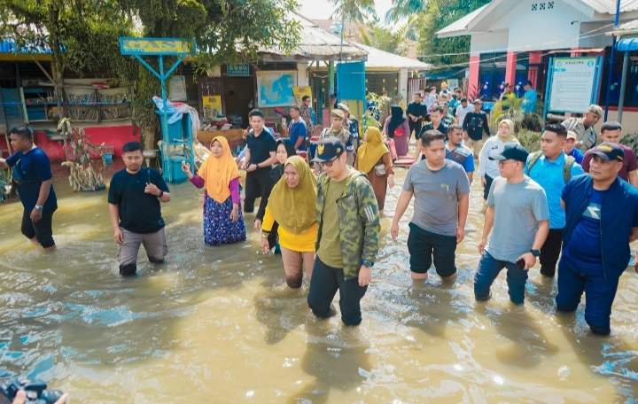 Wali Kota Medan Rico Tri Putra Bayu Waas bersama dengan Wakil Wali Kota Medan H Zakiyuddin Harahap meninjau SDN 066429 di jalan Baru, Kelurahan Terjun, Kecamatan Medan Marelan yang kondisinya memprihatinkan akibat diterjang banjir, Rabu (3/12/2025).