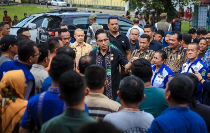 Sambil berjalan kaki, Rico Waas menyapa para pedagang yang ada di pasar Induk Lau Cih. Diantara mereka juga ada yang langsung mengadu kondisi lapak pedagang yang tanah dibawahnya amblas.
